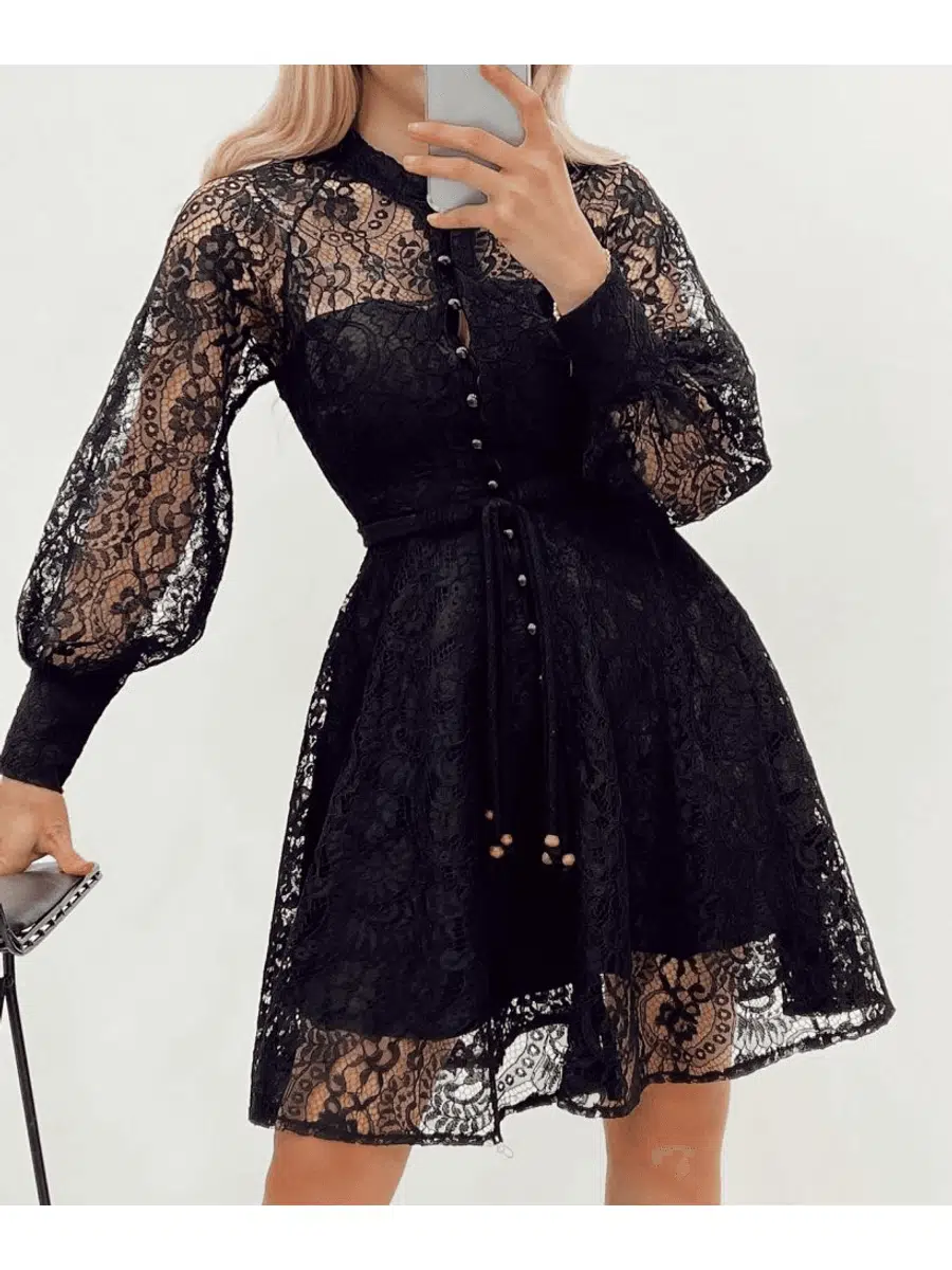 EtiketlerBoydan düğmeli astarlı balon kol fermuarlı tül elbise