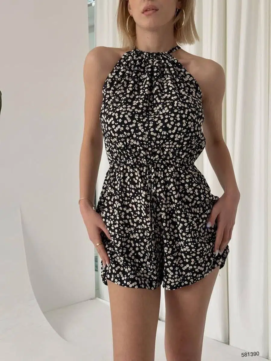 Kadın Bağcık Yaka Desenli Dokuma Viskon Kumaş Şort Tulum (Renkli)