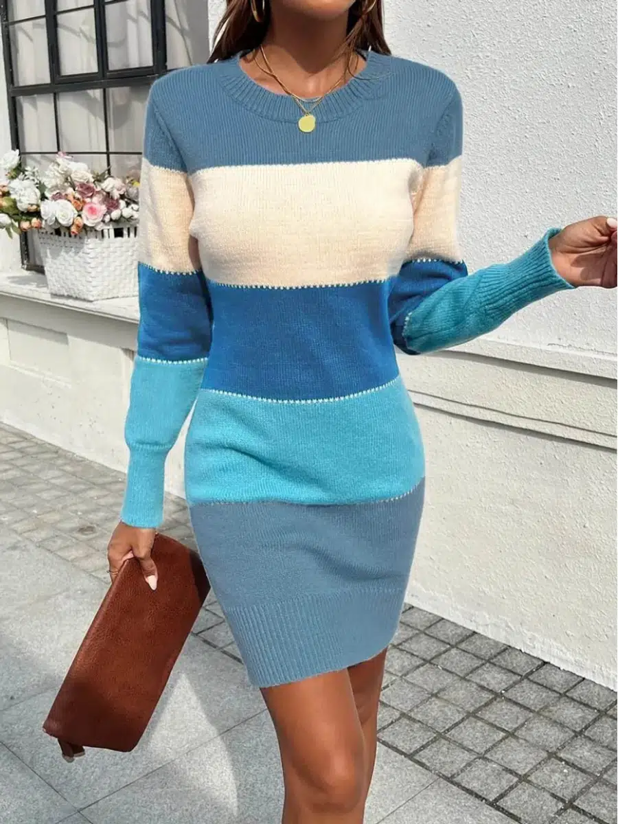 EtiketlerKadın Bisiklet Yaka Çizgili Triko Mini Elbise