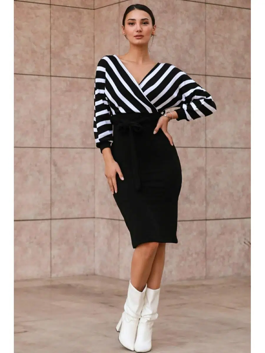 Kadın Çizgi Desenli Kruvaze Yaka Midi boy Triko Elbise