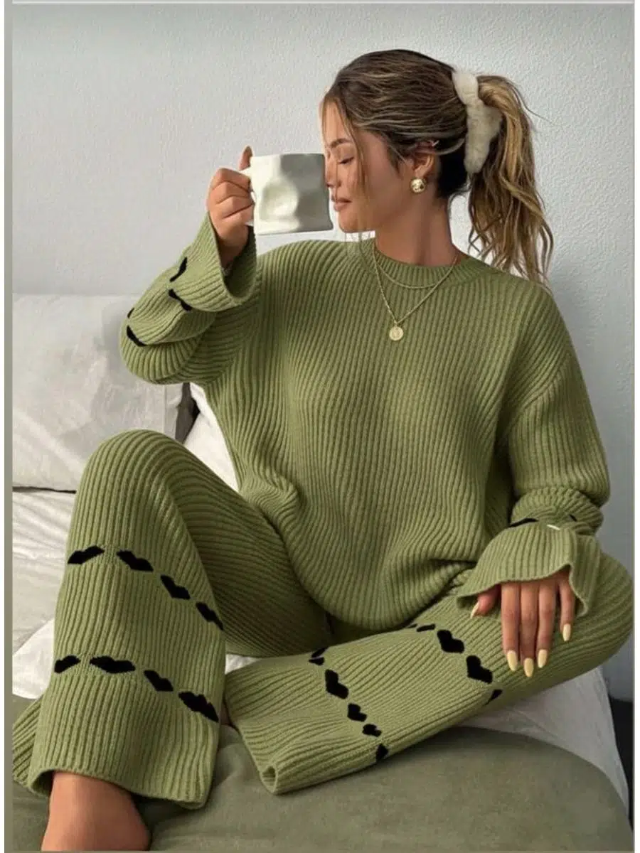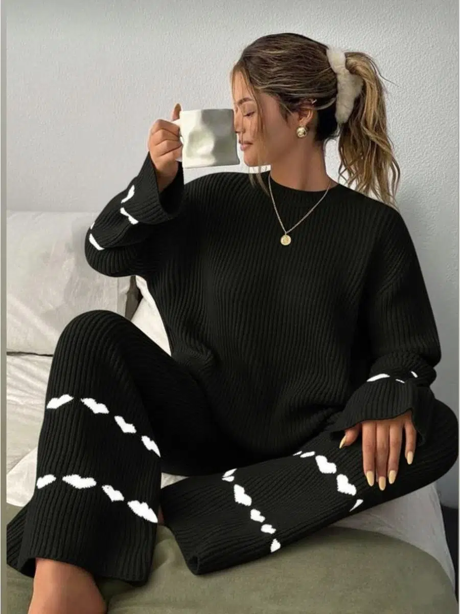 Kadın Kalp Desenli Kazak Pantolon İkili Triko Takım