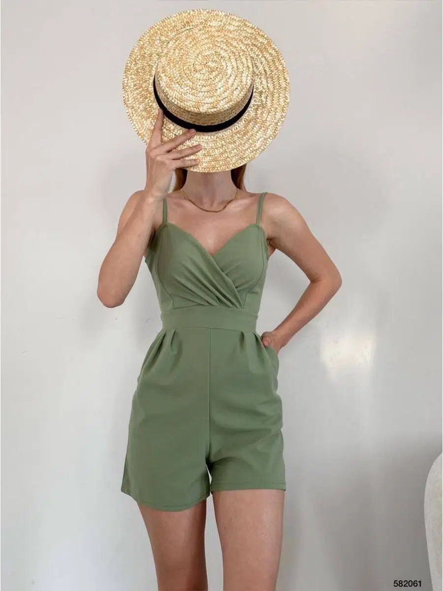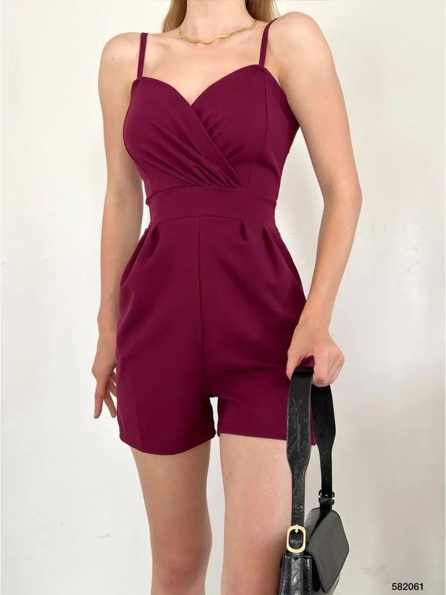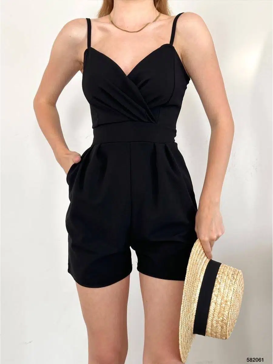 Kadın Krep Kumaş Askılı Kruvaze Yaka Şort Tulum