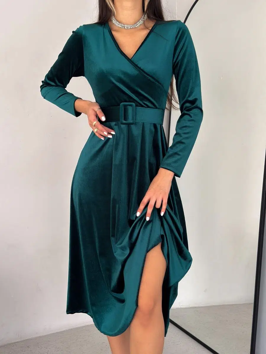 Kadın V Yaka Beli Büzgülü İki İplik Kumaş Elbise (Renkli)