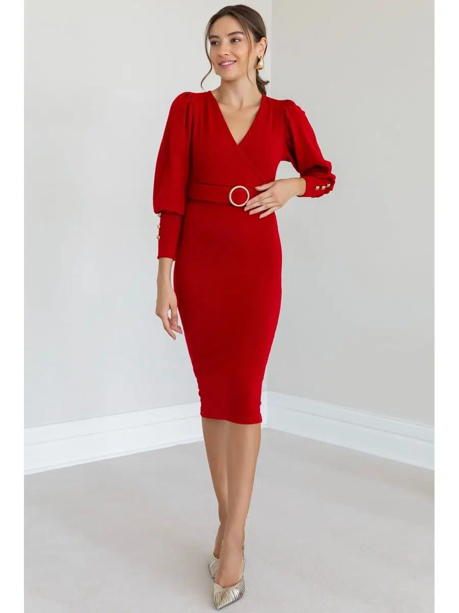 Kadın Kruvaze Yaka Kemerli Kolu Düğme Detay Akrilik Triko Kumaş Midi Elbise (Renkli)