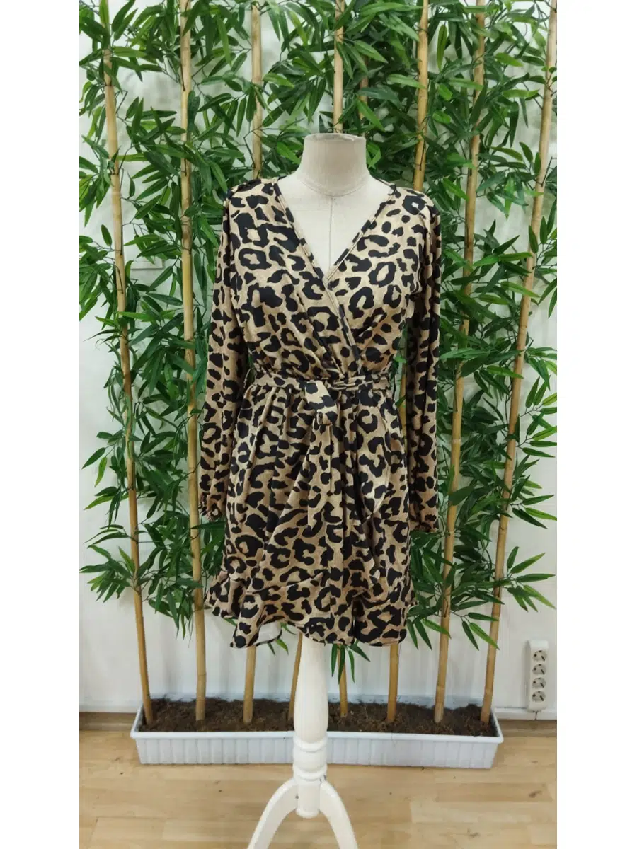 EtiketlerKadın Kruvaze Yaka Kuşaklı Leopar Desenli Dalgıç Kumaş Elbise