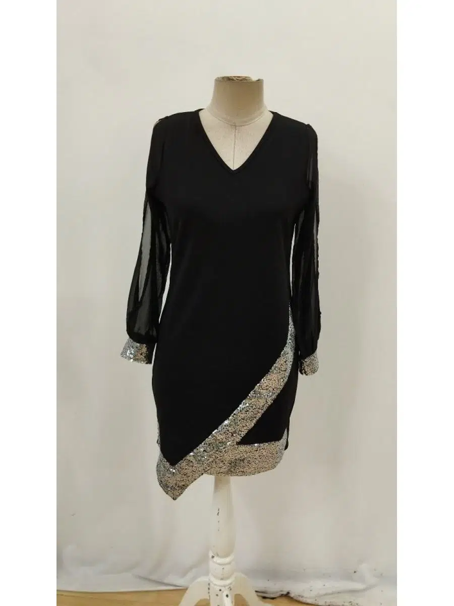 Kadın V Yaka Pulpayet İthal Krep Mini Elbise